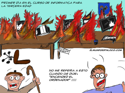 Hoy tengo el placer de presentaros la primera tira cómica de esta web hecha con una tableta digitalizadora sin que aparezca el Paint por ningún lado. La serie a la que pertenecerá esta tira es a «Informática para la tercera edad». Como podréis ver en la de hoy, el pobre profesor tendrá ciertos, ejem, problemillas para poder hacer entender a esos entrañables señores mayores el funcionamiento de las tecnologías modernas de hoy en día…