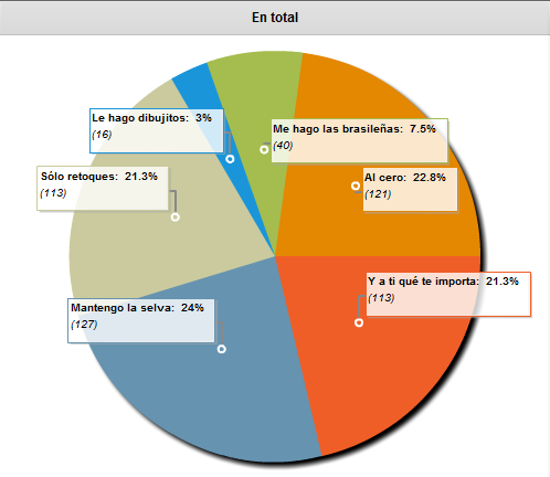 Estoy ahora mismo como un niño con zapatos nuevos con el cambio de lugar del blog. Para estrenarlo os voy a hablar de ingles, que siempre es un tema muy interesante. Hay un debate en la tele y ¿de qué hablan? De ingles. De ingles y pubis. Pubis por aquí, ingles por allá. A la gente le gusta hablar de pelos. O no, pero da igual. El caso es que aquí os traigo los resultados de una encuesta muy peliaguda. Para ilustrar esta encuesta preparé una aplicación en la que meter los resultados y que me hiciera unas gráficas muy guapas. Y diréis: «Coño, eso lo hace el Excel« Y yo: «Ya, pero estaba aburrido». Quería prepararlo para que trastearais vosotros mismos con la aplicación aquí dentro de la web, pero por ahora solo os pongo las imágenes. Todo llegará. Así pues, aquí están los resultados de la encuesta, nada más y nada menos que después de 532 votos.